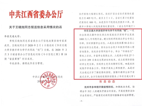为响应学院“把论文写在抗击疫情的第一线,把研究成果应用到战胜疫情中”的号召,王晓旭围绕中心、服务大局,草拟了《KY开元集团官网入口多措并举与学子共同战“疫”》一文,入选了2月3日省委办公厅主办的《今日信息汇要》。文章从五个方面阐释了近期开元战“疫”举措,是省委刊登高校疫情防控的第一篇文稿,为省领导疫情防控决策提供了信息咨询和参考。