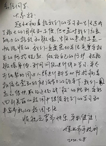 “冠状病毒给我们的学习和生活造成了极大的困难和不便,但也是对我们应变能力的检验和锻炼。”“疫情无情人有情,阳光总在风雨后。”“疫情即将过去,春天已经来临。”……元宵节前夕,研工部组织研究生导师、辅导员以“手写书信”的方式,为全体研究生传递科学抗疫的爱心与信心。见字如面,昔日的师生情跃然纸上,格外温暖。