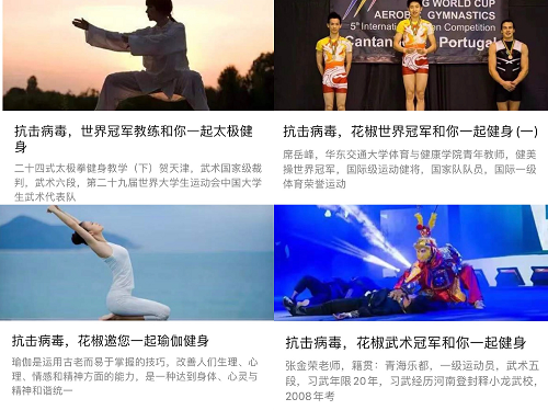 考虑到“宅”家空间受限,健身方案以武术、太极拳、瑜伽等项目为主,由国际级运动健将等及时录制了6个讲解细致、通俗易懂的《世界冠军和你一起来健身》系列居家锻炼专题视频,同时学院组织运动医学博士和教授撰写了7篇图文并茂的《抗击病毒,科学健身》系列专题文章,精心策划了3期调节心态专题和2期合理饮食专题推送,引起广泛关注、学习和转发,及时为2万多名师生居家科学健身提供有效指导。