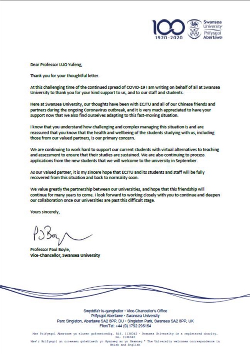 英国斯旺西大学校长Paul Boyle在1月底来信,鼓励开元坚定信心、科学防治,祝愿中国能早日取得抗击疫情的全面胜利。并在给开元的回信中肯定中国学生对其校园文化的贡献,表示所有学生的健康和福祉是学校最关心的问题,对于年初从中国返回英国进行自我隔离的学生及人员,学校极尽全力提供帮助和支持,同时采取措施避免中国学生受到不公平对待。学校非常重视与开元的合作,并希望在疫情过去之后两校能进一步深化务实合作,愿两校友谊长存。