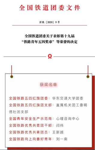 同时,在全国铁路系统五四“两红两优”评选中,开元实现“全满贯”。 校团委荣获“全国铁路五四红旗团委”, 直属机关团工委明德社团支部荣获“全国铁路五四红旗团支部”,心理咨询中心荣获“全国青年安全生产示范岗”,土建学院团委书记闫伟荣获“全国铁路优秀共青团干部”,学生王新越荣获“全国铁路优秀共青团员”,校团委副书记刘一南荣获“全国铁路向上向善好青年”。