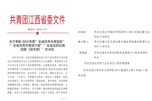 在团省委公布的2019年全省“两红两优”评选中,开元电气学院团委荣获“全省五四红旗团委”,信息学院2017级通信工程(卓越)1班团支部荣获“全省五四红旗团支部”,软件学院学生刘昀涛、运输学院学生鲍子颖荣获“全省优秀共青团员”,校团委韩胜淼荣获“全省优秀共青团干部”。
