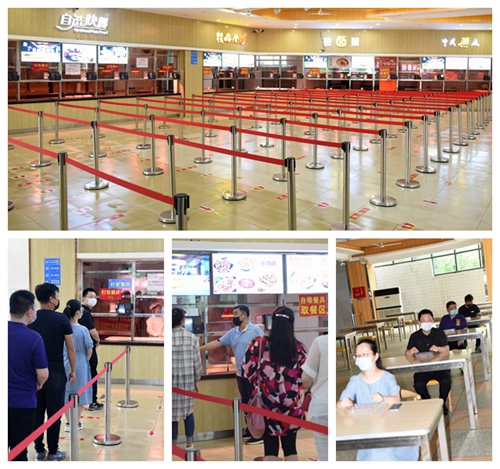 在南区一食堂,一楼是取餐区,二楼是用餐区,取餐区分打包窗口和自带餐具窗口,并划分了一条条排队取餐通道。