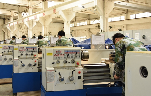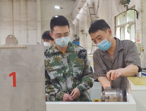 在机械加工车间,学生身着迷彩服,聚精会神地操控仪器设备。指导老师何依云表示,虽然现在工作量很大,但我们早有心理预期,并努力克服困难,只为让同学们能如期完成实训学习。(熊子钰 摄)