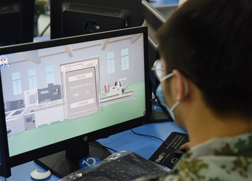 经老师指导,学生正通过虚拟仿真系统感知火车轮检测模拟操作。为做好日常防护,中心所有机房的电脑键盘均套装塑料薄膜,便于每日消杀。(欧阳桑瑞 摄)