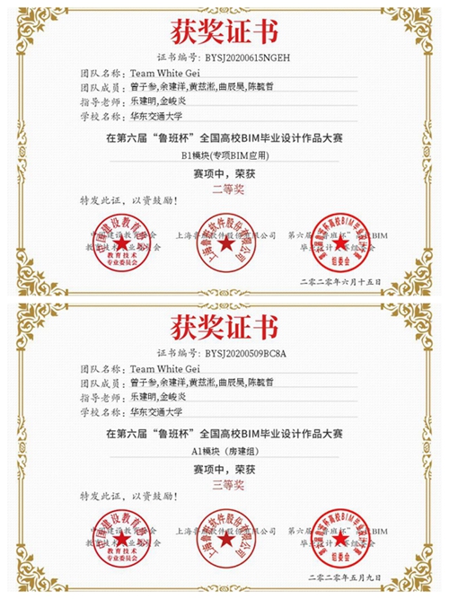 由乐建明、金峻炎老师指导,曾子参、余建洋、黄兹淞、曲辰昊、陈毓哲组成的“Team White Gei”团队凭借“南昌市万科城小学项目全专业建模及碰撞优化、进度计划管理专项BIM应用”获得了应用赛项二等奖、建模赛项三等奖。