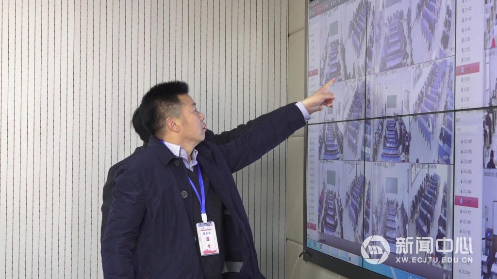 在智慧教室管理中心,校领导调看了考试教室监控录像,查看老师监考和学生考试情况。