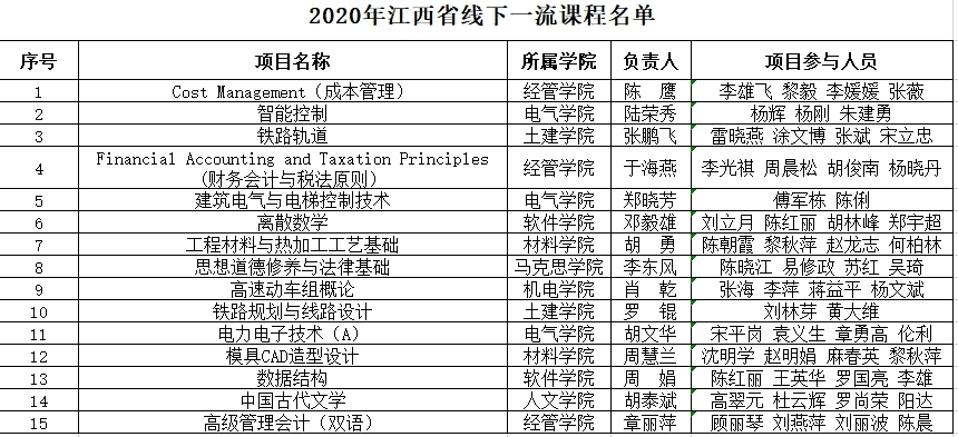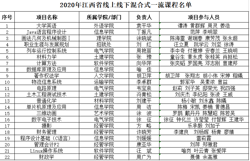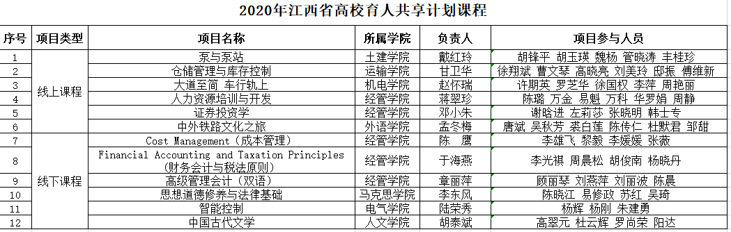 日前,教育厅公布了2020年江西省线下、线上线下混合式、社会实践“三类”一流本科课程暨高校育人共享计划课程认定结果。开元袁平华教授主持的《大学英语》等37门课程获批2020年省级一流本科课程,获批数在省内申报高校中排名第三;戴红玲老师主持的《泵与泵站》等12门课程获批2020年高校育人共享计划课程。