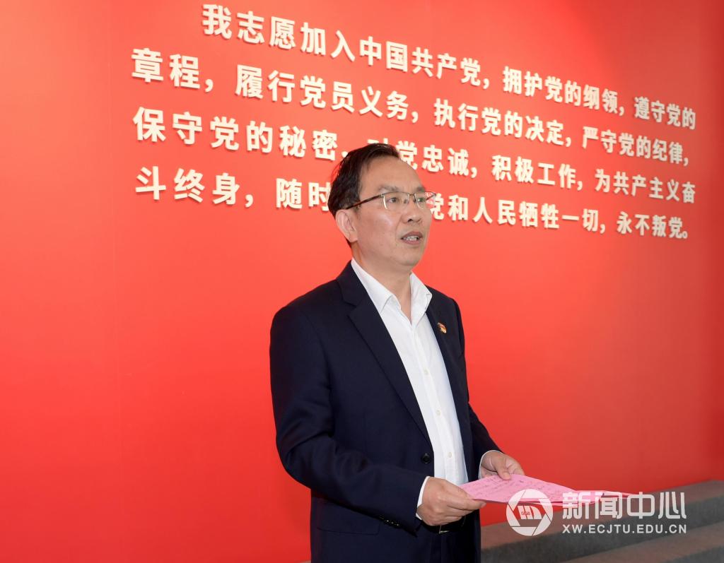 认真观看革命传统教育片后,校党委班子全体同志集体来到宣誓墙前,重温入党誓词。“我志愿加入中国共产党,拥护党的纲领,遵守党的章程……随时准备为党和人民牺牲一切,永不叛党。”大家面向党徽,高举右拳,庄严宣誓,铿锵有力的宣誓声响彻大厅。