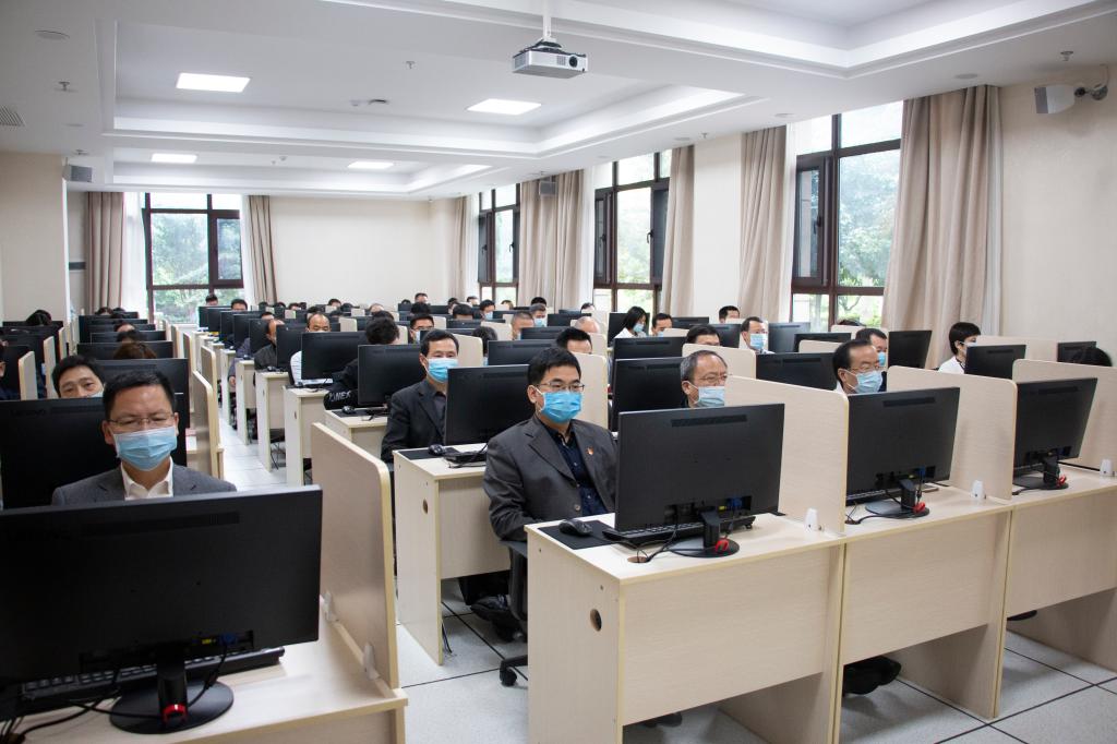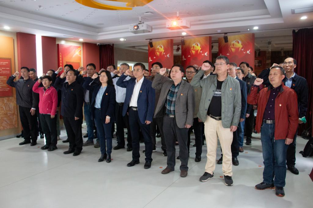 在宣誓厅宣誓墙前,面对党旗,全体党员干部庄严地举起右手,重温入党誓词。在廉政教育室,大家观看了警示教育片,并现场进行了党章知识测试。