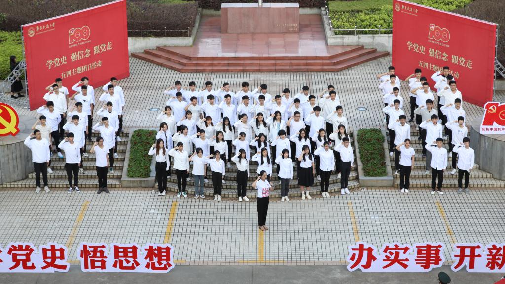 活动现场,百名青年团员以“热血”快闪还原1919年五四运动的场景,上好讲述新民主主义开端的“第一课”。运输学院詹天佑班学生通过朗诵讲述了1919年至今的中国铁路发展史,以“铁路强国”的发展之路,告慰中国铁路之父——詹天佑先生。学校国旗护卫队学生代表讲述八一南昌起义,赓续红色血脉,告慰革命先辈。经管学院“红色走读”代表队演绎《可爱的中国》,致敬革命烈士方志敏对信仰的绝对忠诚、对国家和民族的深沉大爱。天佑学院鹏英班讲述赖传珠上将的革命故事,激励华交青年继往开来、勇于担当,同心共筑“百年交大梦”。党史学习教育青年宣讲团代表以朗诵的形式,展示了“开天辟地”“改天换地”“翻天覆地”“惊天动地”四个主题,引导全校团员青年从百年党史中汲取奋进力量。在新入团学生集中入团仪式环节,90名新团员面对团旗,举起右手,庄严宣誓,誓言铿锵,丹心闪耀。