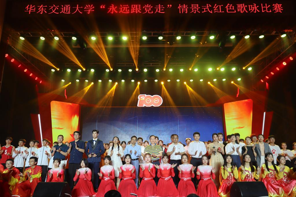 《胜利之歌》《歌唱祖国》《我们走在大路上》,欢快的旋律洋溢着胜利的喜悦,彰显了建设社会主义新中国的自信与豪迈。《春天的故事》《北京欢迎你》《我们的新时代》《最美的约定》《百年》等歌曲,以朗诵、舞蹈、合唱、情景剧等多种形式,集中反映了中国共产党领导全国各族人民经过不懈奋斗,迎来了从站起来、富起来到强起来伟大飞跃的辉煌历程。比赛在全场师生同唱《奋进,华东交大》的雄壮歌声中落幕。