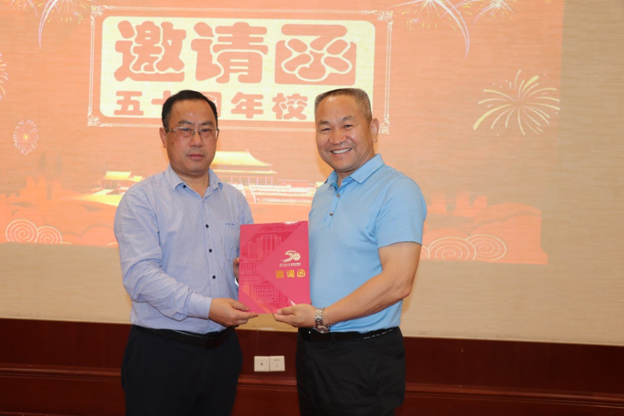 校党委副书记肖长春向山东校友会发送50周年校庆邀请函。