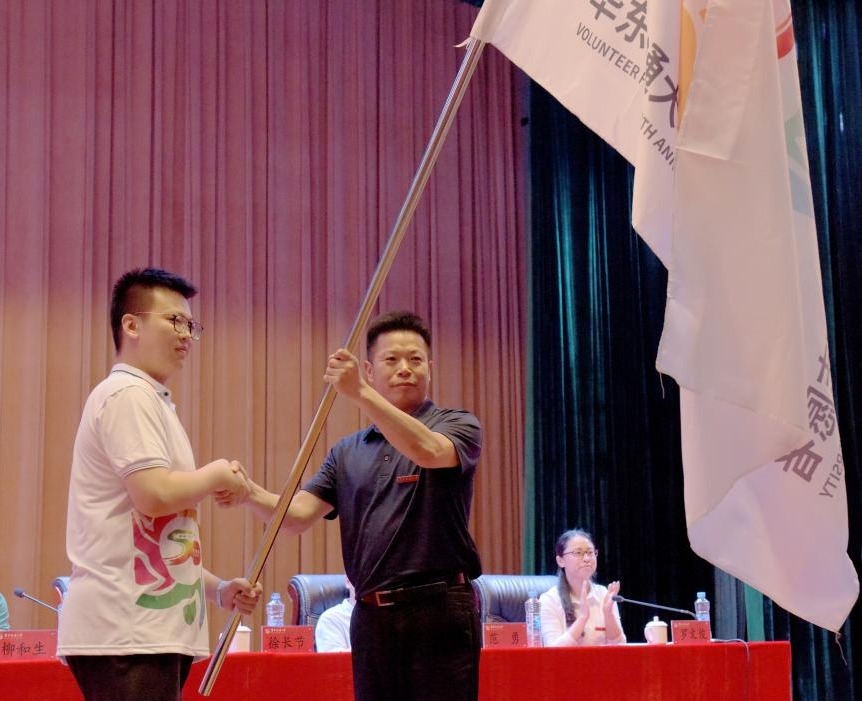 校党委副书记、副校长徐长节向校庆志愿者服务队授旗。