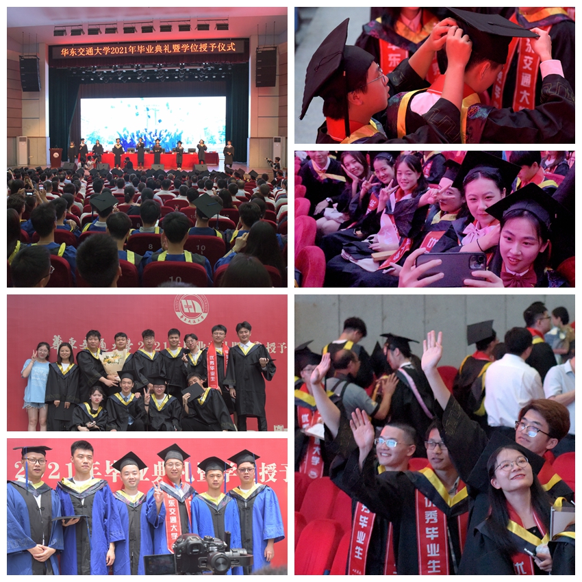 拨穗礼成,全场合唱校歌《奋进,华东交大》,巨幅校旗在毕业生手中缓缓传递。现场领导和老师全体起立,目送毕业生挥手告别,奔赴前程。