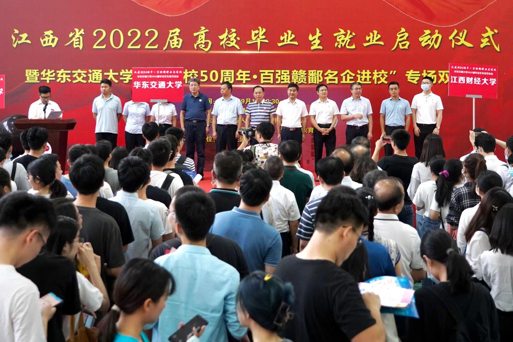 省就业创业服务中心、省教育评估监测研究院、南昌市经开区、上饶市经开区相关负责人,东华理工大学、江西财经大学、江西农业大学、江西理工大学等高校招就处负责人,开元招就处负责人、各学院党委书记、党委副书记代表参加仪式。(摄/方晨旭)