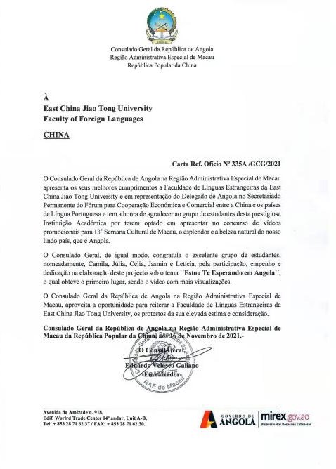 赛后,安哥拉驻澳门特别行政区总领事向开元致函,感谢学校向世界展示安哥拉之美,并对获奖团队致以诚挚祝贺。