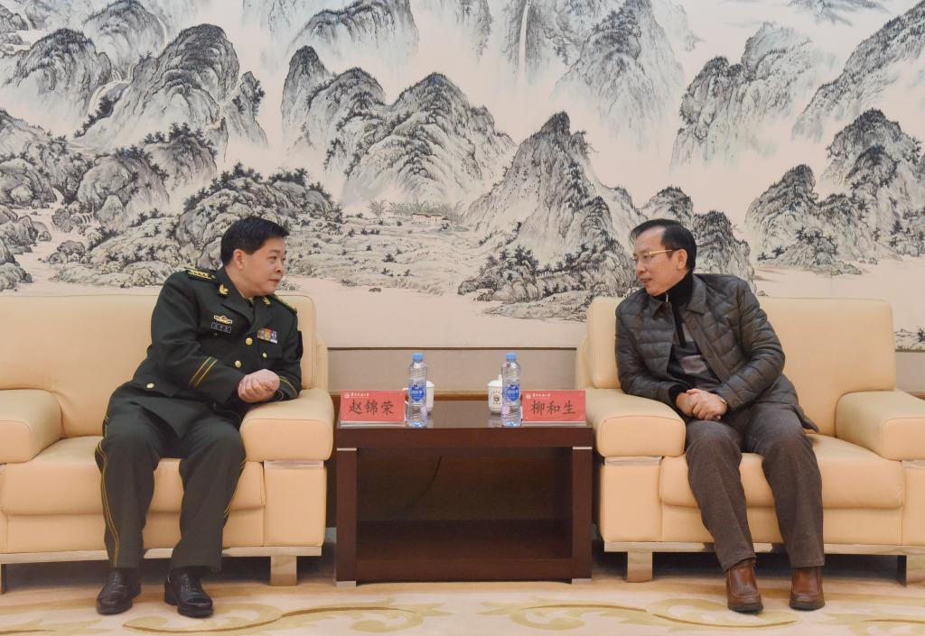 武警江西总队政治工作部主任赵锦荣大校一行来校交流,校党委书记柳和生出席交流会。