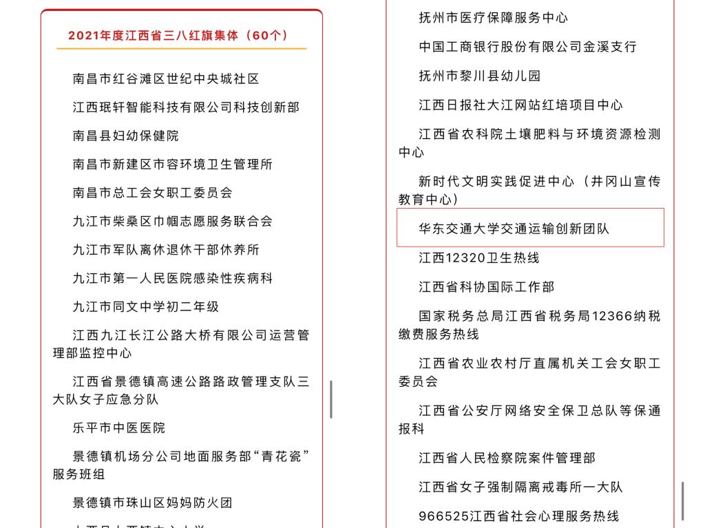近日,2021年度江西省三八红旗手(集体)评选结果揭晓,开元徐玉萍教授负责的KY开元集团官网入口交通运输创新团队获评江西省三八红旗集体(全省本科高校唯一)。