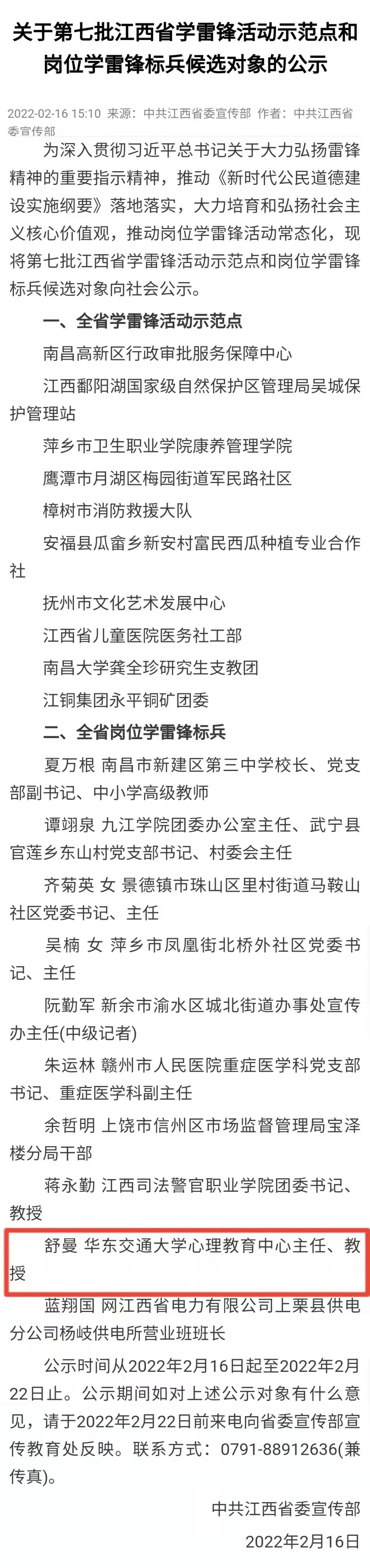 近日,第七批江西省学雷锋活动示范点和岗位学雷锋标兵名单公布,开元心理教育中心(心理素质教育研究院)舒曼教授入选“岗位学雷锋标兵”。