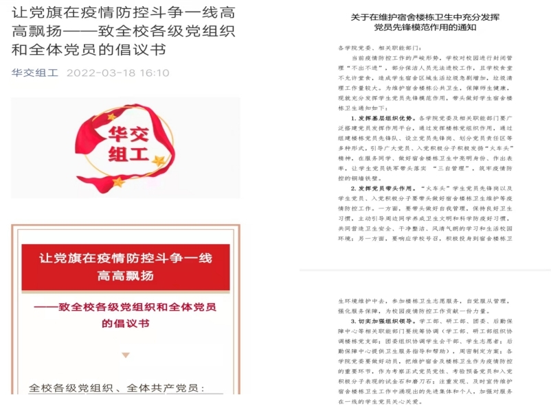 校党委组织部迅速下发《致全校各级党组织和全体党员的倡议书》《关于在维护宿舍楼栋卫生中充分发挥党员先锋模范作用的通知》等文件,发动基层党组织和师生党员带头争做铁人铁军,共筑疫情防控的铜墙铁壁,坚决守牢学校疫情防控“主阵地”。