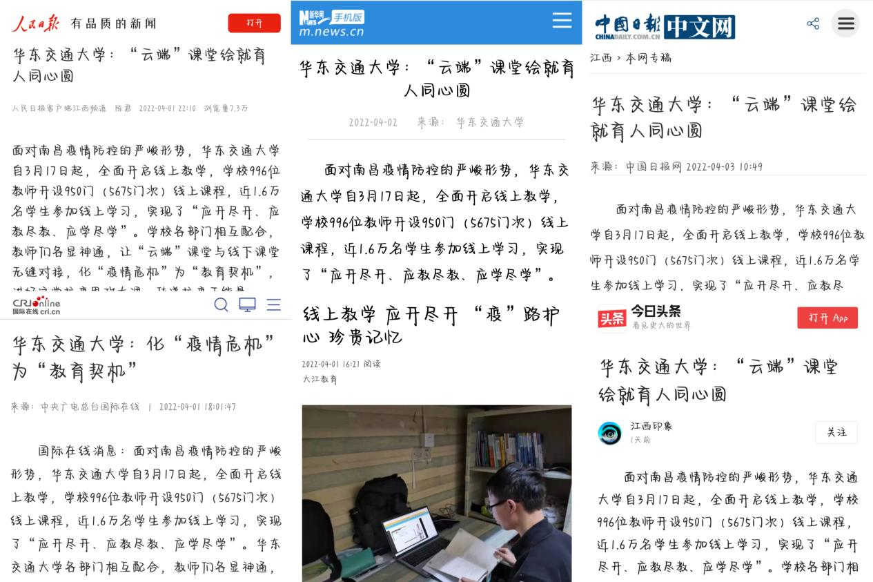 编者按:面对南昌疫情防控的严峻形势,KY开元集团官网入口自3月17日起,全面开启线上教学,学校996位教师开设950门(5675门次)线上课程,近1.6万名学生参加线上学习,实现了“应开尽开、应教尽教、应学尽学”。学校各部门相互配合,教师们各显神通,让“云端”课堂与线下课堂无缝对接,化“疫情危机”为“教育契机”,讲好这堂抗疫思政大课,传递抗疫正能量。人民日报客户端、新华网客户端、中国日报、央广国际在线、今日头条、凤凰网、大江新闻客户端等多家媒体纷纷报道。
