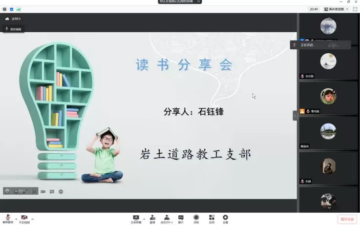 石钰锋倡导学生要树立终身学习的好习惯,2019年以来,他每月坚持开展读书分享会,期间从未间断,至今已举办30余期,分享60余本书籍,书目种类广泛,内容涉及文史哲、心理学、社会学、经济学等领域。疫情防控期间,他多次筹划开展线上读书分享会,师生共聚云端,品读好书。