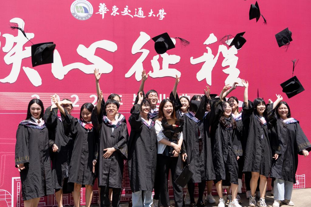拨穗礼成,全场合唱校歌《奋进,华东交大》,现场领导和老师全体起立,目送2022届毕业生离场,奔赴前程。