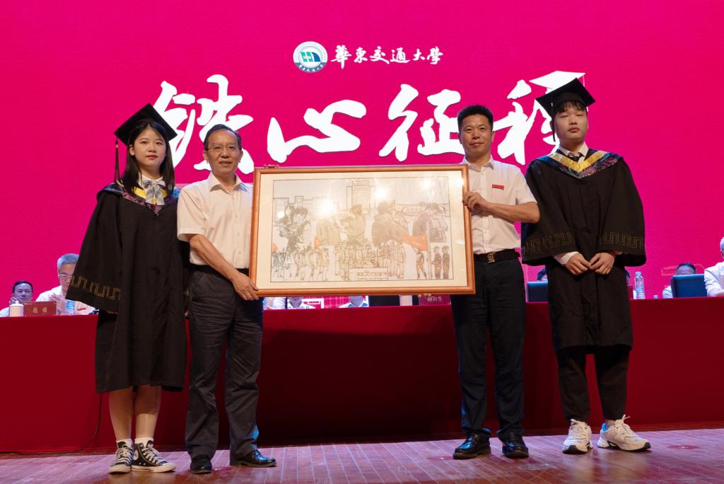 校党委书记柳和生,校党委副书记、校长徐长节代表学校接受毕业生赠送母校的《华交学子战疫图鉴》。