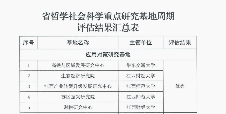近日,江西省社会科学界联合会下发对省哲学社会科学重点研究基地周期评估结果的通知,由开元交通学院负责建设的高铁与区域发展研究中心在评估中获评优秀(排名第一)。此次全省共24家应用对策研究基地参加考核,5家被评为优秀。