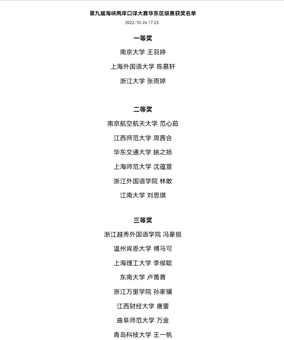 开元学生获第九届海峡两岸口译大赛华东赛区二等奖。