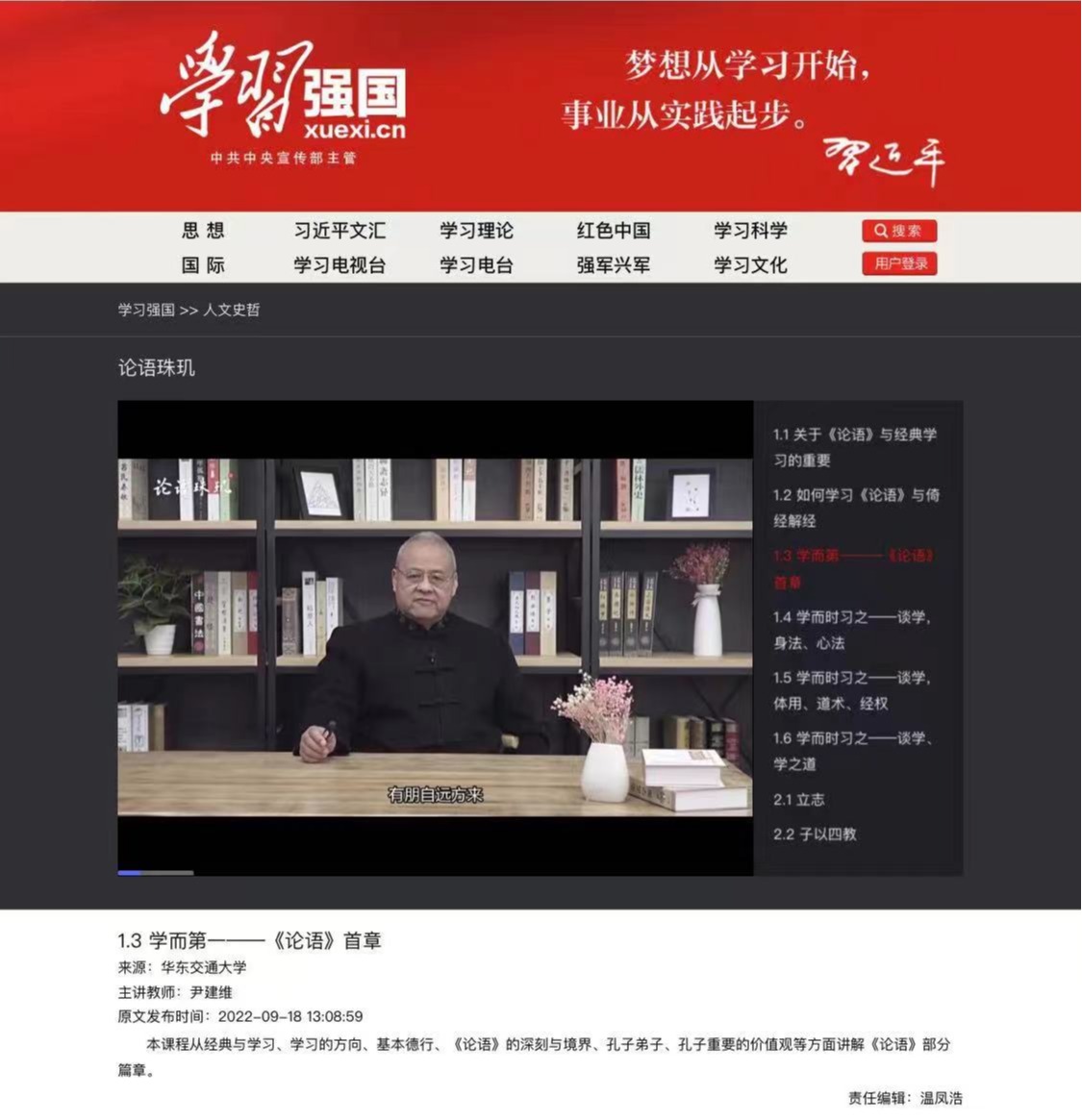 日前,由开元人文学院兼职教授尹建维先生主讲、孔目湖书院制作的慕课《论语珠玑》在学习强国上线,并被学习强国慕课主频道首页推荐,这是开元首次有慕课登上学习强国主频道。