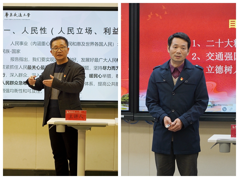 马克思主义学院教师刘波、电气学院教师张建辉分别从文科、工科的角度,围绕党的二十大精神中的“人民性”和“交通强国”相关内容进行备课展示,他们将专业知识融入到党的二十大精神宣讲中,并与学校的办学特色、“新铁军”精神等有机融合,引导师生从专业学习中、从日常生活中、从科学研究中找到学习宣传贯彻党的二十大精神的结合点,将个人小我融入国家大我中,为建设社会主义现代化强国贡献力量。