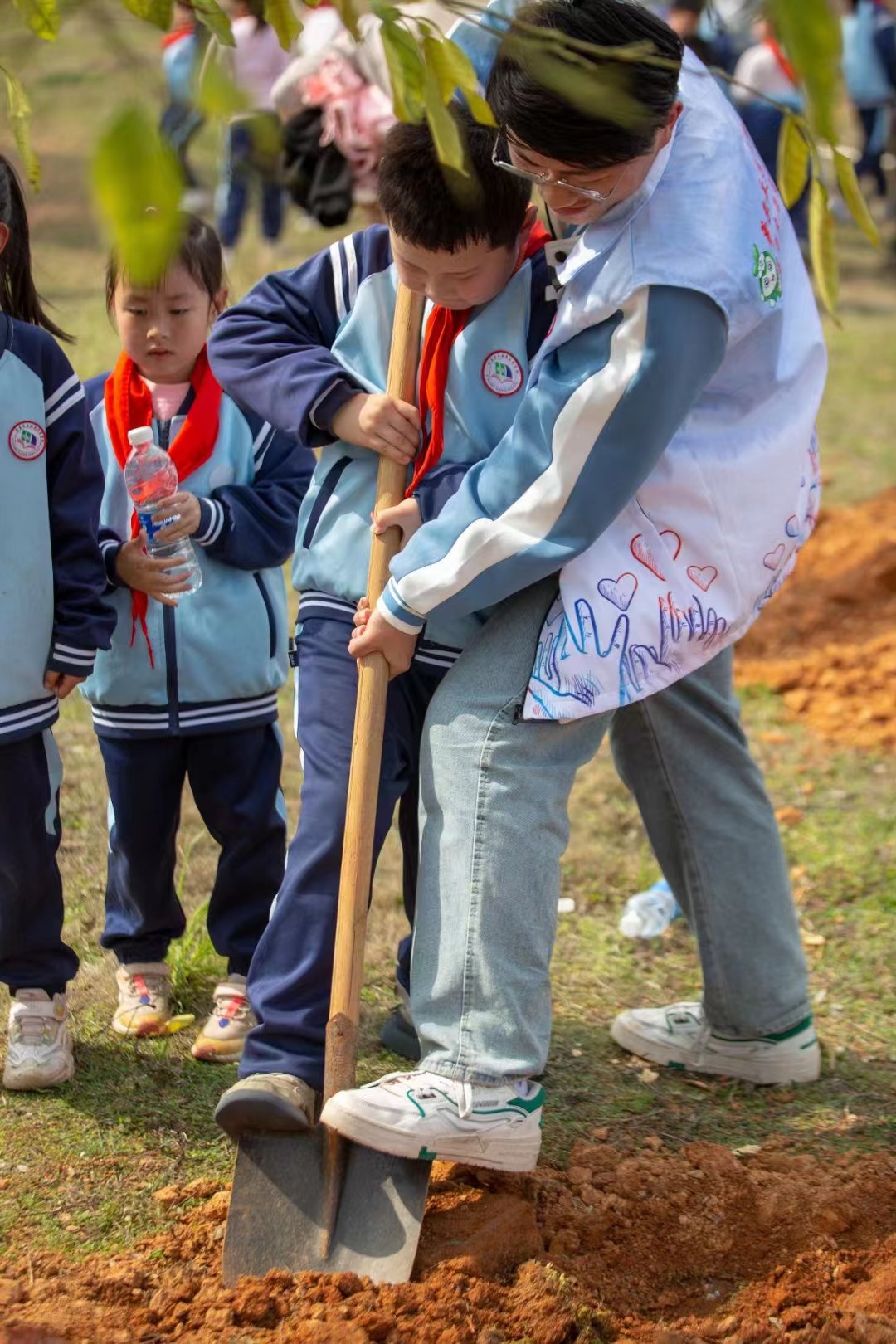 师生义务植树为校园增添绿意。