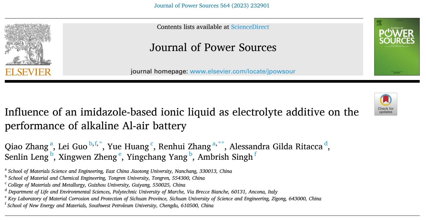 化学专业研二学生张巧在碱性-空气电池性能研究的成果以“Influence of an imidazole-based ionic liquid as electrolyte additive on the performance of alkaline Al-air battery”为题发表在国际重要杂志《Journal of Power Sources》上(https://doi.org/10.1016/j.jpowsour.2023.232901),该期刊2022年的IF=9.794,属SCI一区期刊。开元材料学院副教授张仁辉为论文通讯作者。