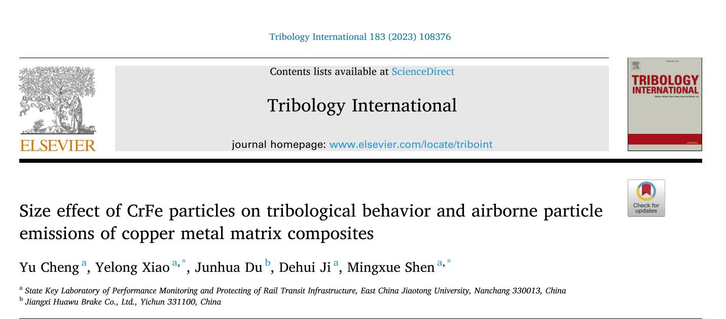 材料与化工专业研三学生成煜对铜基粉末冶金摩擦材料大气颗粒物排放行为的研究成果以“Size effect of CrFe particles on tribological behavior and airborne particle emissions of copper metal matrix composites” 为题发表在国际摩擦学领域顶级期刊《Tribology International》上(https://doi.org/10.1016/j.triboint.2023.108376),该期刊2022年的IF=5.620,属中科院1区TOP期刊。青年教师肖叶龙博士为论文第一通讯作者。