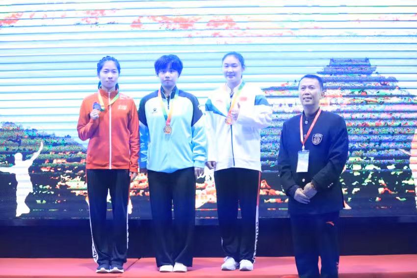 2021级刘鑫荣获女子丁组长拳金牌、刀术金牌、棍术金牌。