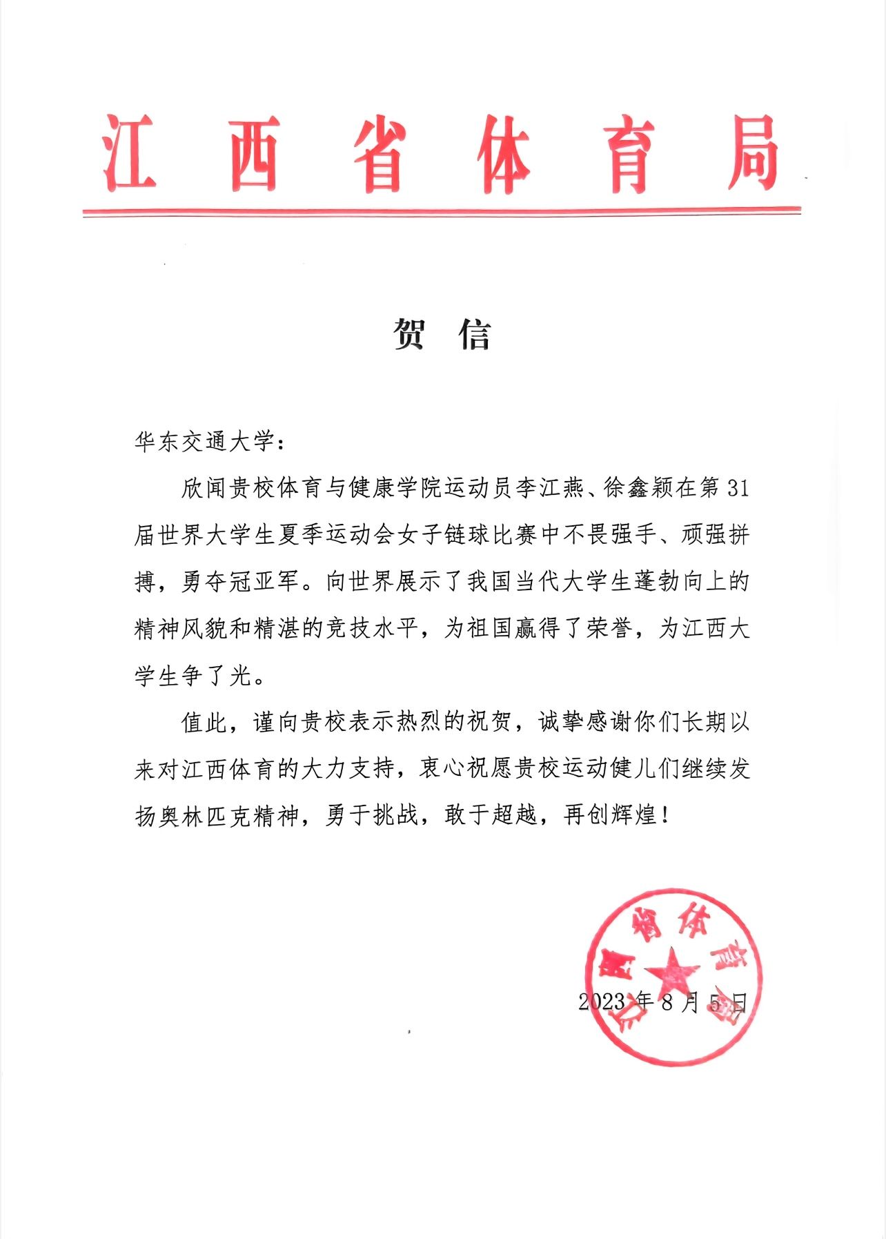 近日,江西省体育局发来贺信,对学校2名学生在第31届世界大学生夏季运动会女子链球比赛中勇夺冠亚军表示热烈的祝贺。