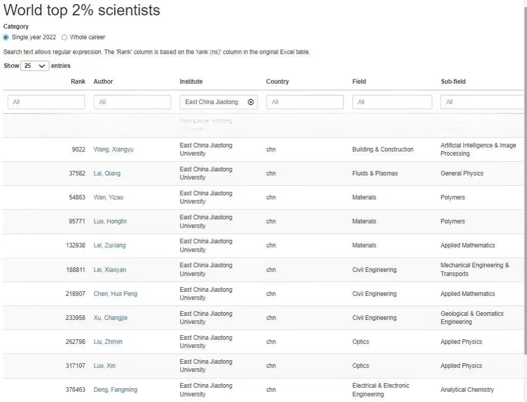 World’s Top 2% Scientists榜单以Scopus数据库为依据,基于引用、h 指数、共同作者调整后的 hm 指数、不同作者位置的论文引用,形成综合指标c-score,着重于学者的引用影响力及作者贡献度,而非生产力。根据其“职业长期影响力”和“年度影响力”,从960万名科学家中遴选出世界排名前2%的顶尖科学家共约20万名,分为22个领域和174个子领域。该榜单提供了一个科学家长期科研表现及影响力的衡量标准,能够更客观、更真实地反映科学家的学术影响力。