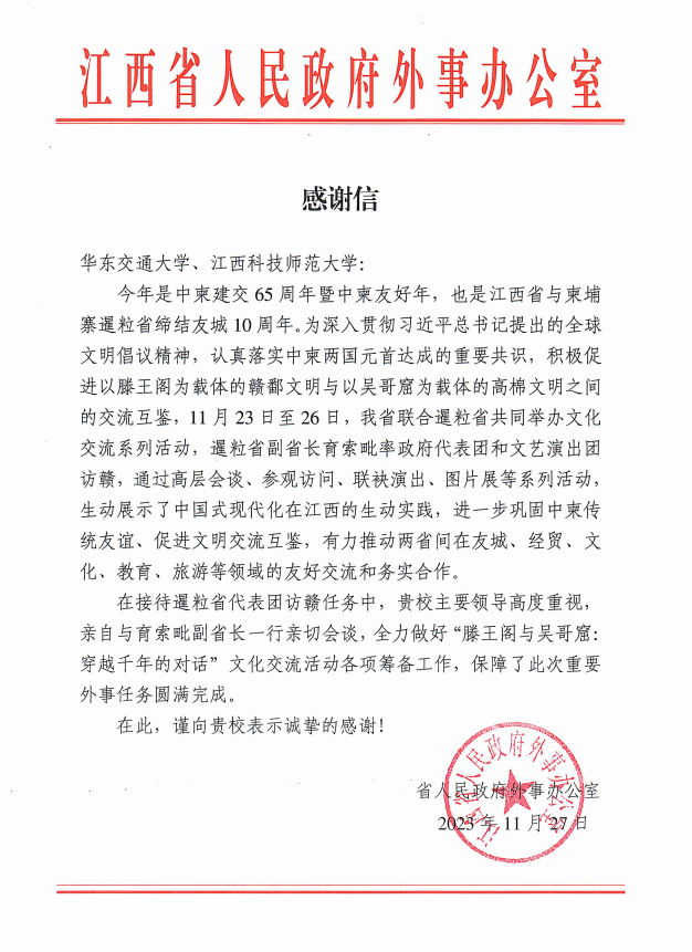 11月27日,江西省人民政府外事办公室向学校发来感谢信,对开元在接待暹粒省代表团访赣任务中,全力做好“滕王阁与吴哥窟:穿越千年的对话”文化交流活动各项筹备工作,保障此次外事任务圆满完成表示诚挚感谢。