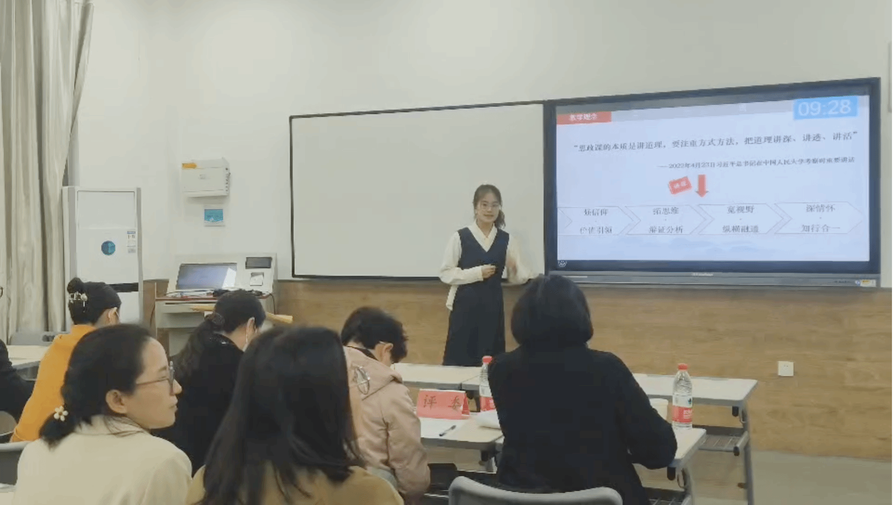 决赛采取说课的方式,每位参赛教师的展示时间为10分钟。根据说课的主题,参赛教师们分课程思政组决赛场、党课、团课组决赛场、思想政治理论课组三个赛场进行比赛。