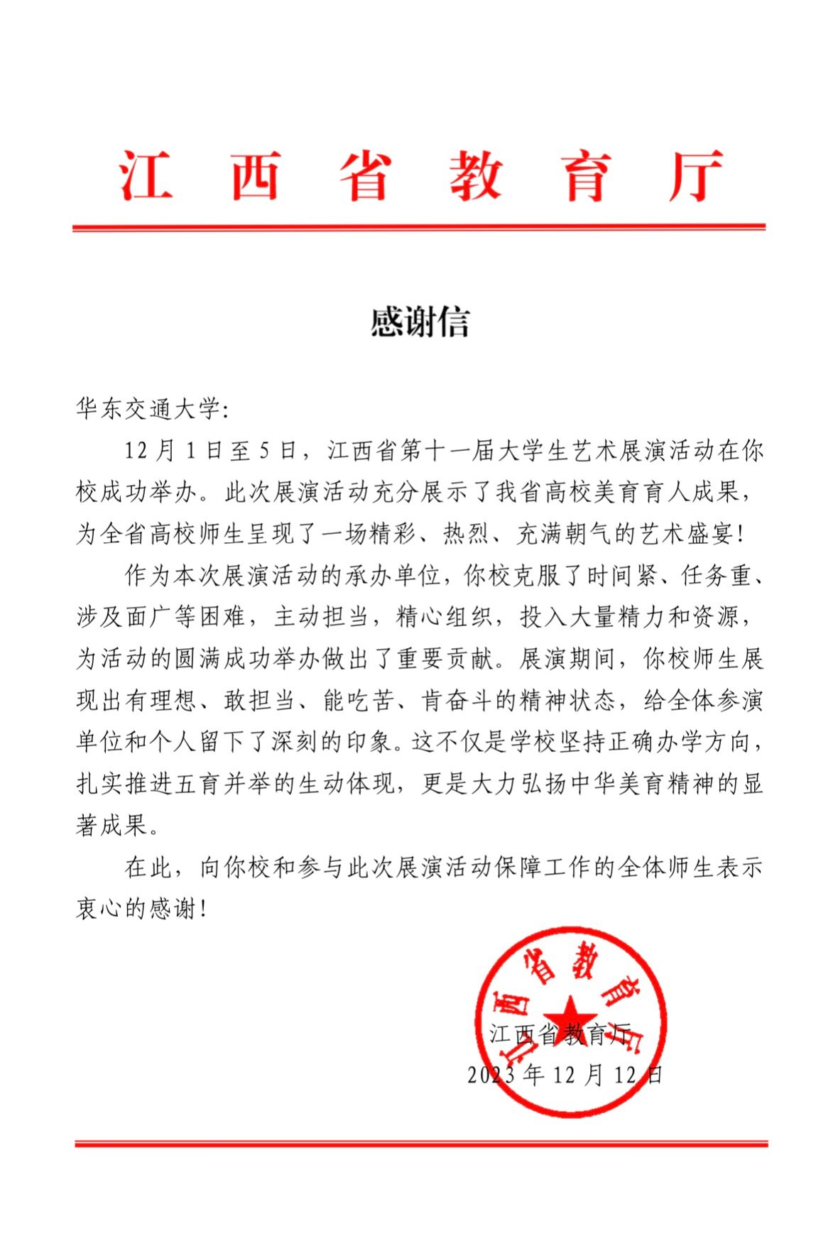 近日,江西省教育厅向开元发来感谢信,对开元承办江西省第十一届大学生艺术展演活动和参与此次展演活动保障工作的全体师生表示衷心感谢。