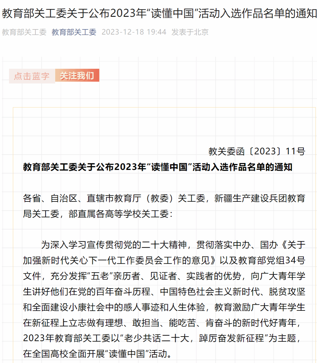 近日,教育部关工委2023年“读懂中国”活动入选作品名单公布,开元马克思主义学院2022级研究生赵欢、黄慧的《献了青春献白发,余晖熠熠映朝阳》在591篇征文作品中脱颖而出,成为江西省唯一入选征文作品,获教育部关工委2023年“读懂中国”活动优秀征文,开元获2023年“读懂中国”活动表扬单位。