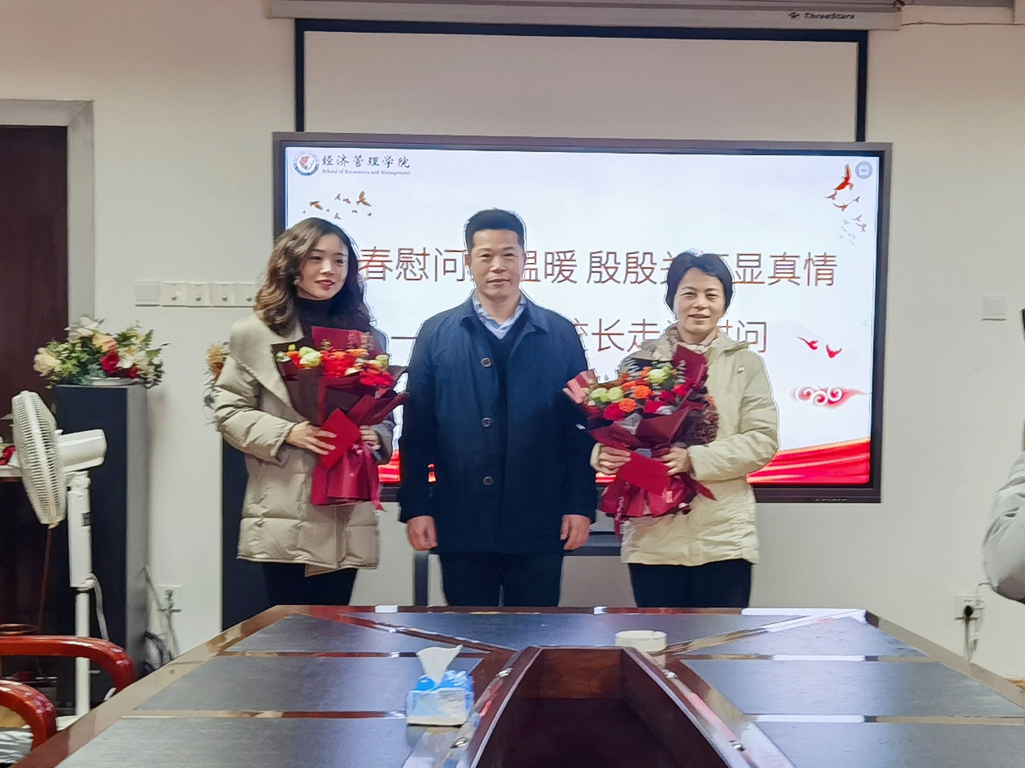 在经管学院办公室,徐长节亲切慰问了经管学院教师殷霄雯、周云洁,详细了解她们的工作、生活情况,叮嘱她们要注意劳逸结合,保持健康的体魄,以良好的心态对待困难,乐观面对生活。