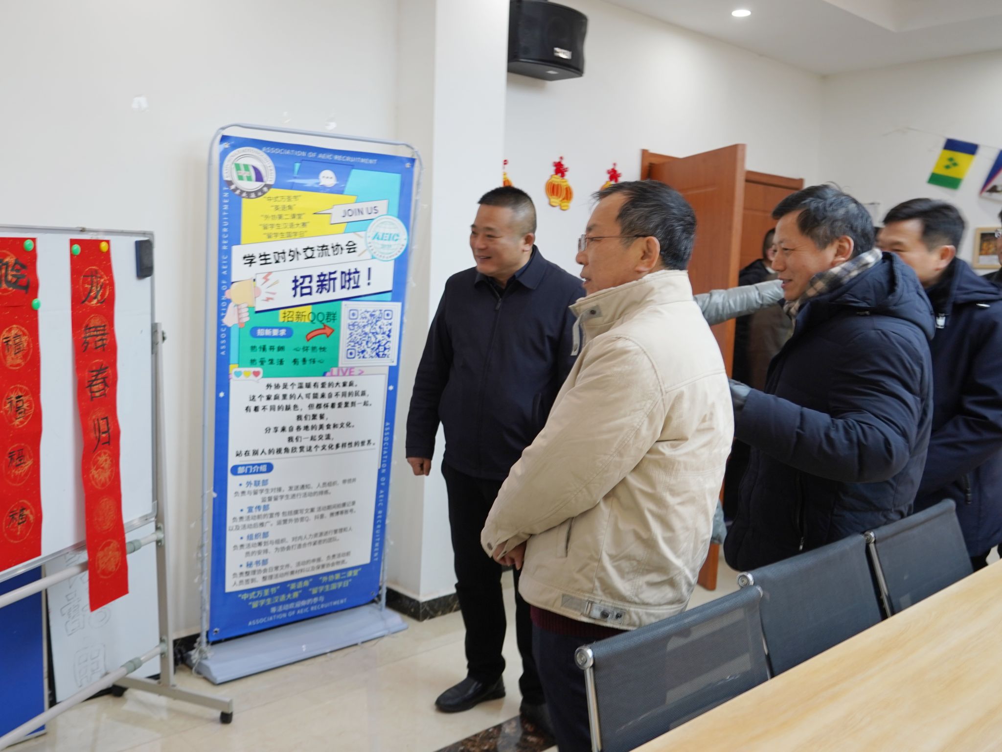 在留学生公寓,柳和生一行欣赏了留学生们的手工、书法作品,并与在场的留学生们亲切交谈,询问他们的学习生活情况,希望他们发扬龙马精神,在新的一年里学习进步。