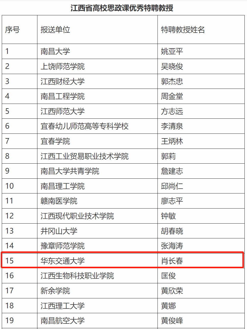 为了推动思想政治理论课教育教学队伍建设,根据《全国“大思政课”建设综合改革试验区江西问题式专题化团队教学改革实施方案》的部署要求,自2023年12月开始,江西省教育厅面向全省高校遴选一批在推动学校思政课课堂教学、实践教学、队伍建设方面发挥重要示范带动作用的思政课优秀特聘教授、在推动思政课教学改革创新上发挥积极作用的优秀兼职教师。本次评选共评出20名高校思政课优秀特聘教授、43名高校思政课优秀兼职教师。
