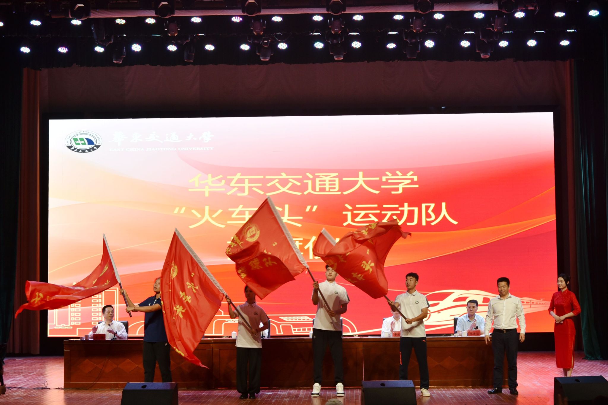 校党委副书记、校长徐长节为“火车头”运动队授旗。