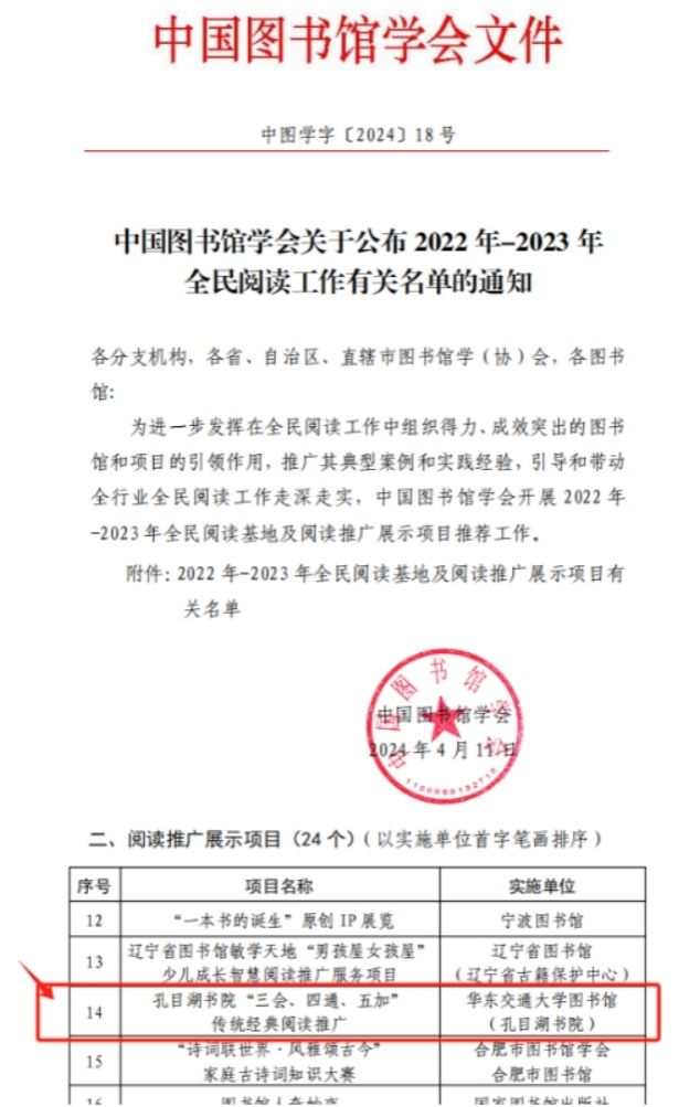 日前,中国图书馆学会发布《中国图书馆学会关于公布2022年-2023年全民阅读工作有关名单的通知》。孔目湖书院申报的《孔目湖书院“三会、四通、五加”传统经典阅读推广》项目进入中国图书馆学会“2022年-2023年阅读推广展示项目”名单。全国共24个项目入选该项目名单,其中高校仅8个项目入选。