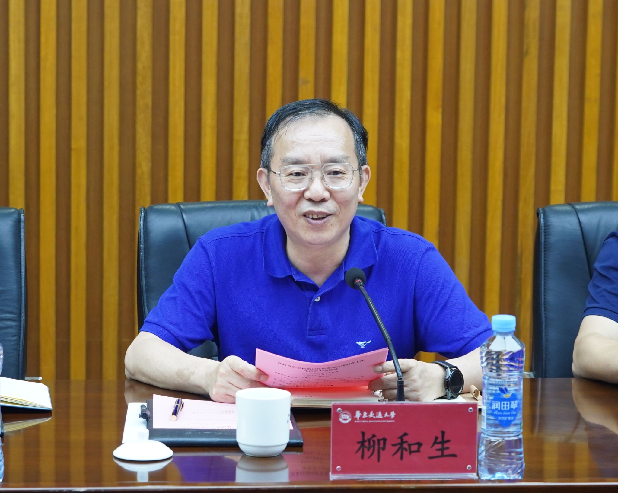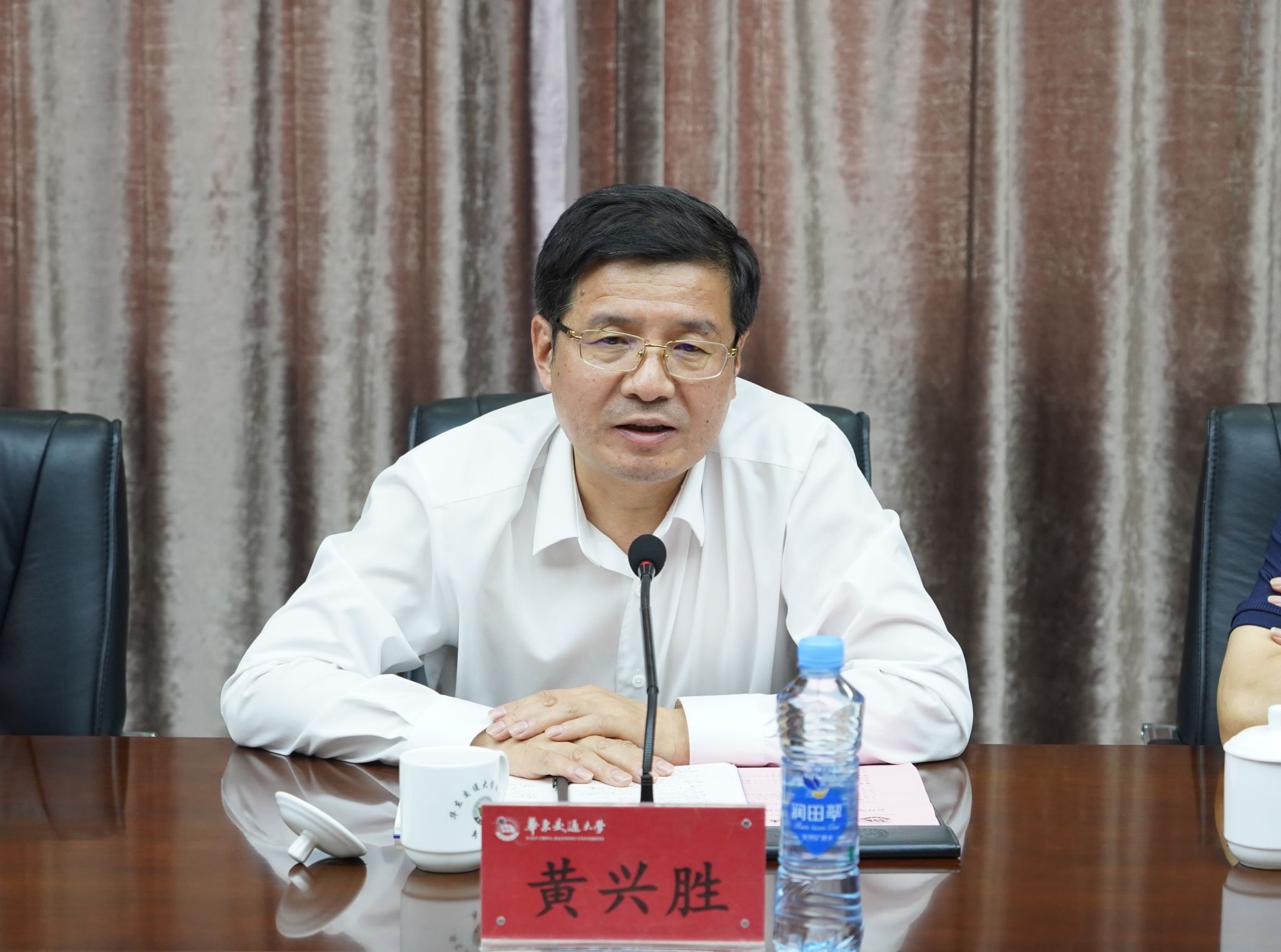 柳和生代表学校致欢迎辞。首先他向黄兴胜一行表示热烈欢迎,向教育部和省教育厅一直以来对学校的关心支持表示衷心感谢,并简要介绍了校情。他指出,华交是一所很“铁”的大学,也是一所很“红”的大学,生长于江西这片红色热土的华交天然就有红色基因。华交红为基因、铁为本性,华交人就是要做用红色基因永葆政治忠诚、坚守理想信念、锤炼过硬作风、助力事业发展的新时代的“红铁军”。近年来,学校围绕“红”与“铁”,积极打造“红”为底色、“铁”为特色的校园文化,全面构筑以红色基因铸就铁血特质、以铁血特质彰显红色基因的精神家园。他希望在教育部、省教育厅的指导和帮助下,学校宣传教育工作再上新的台阶。