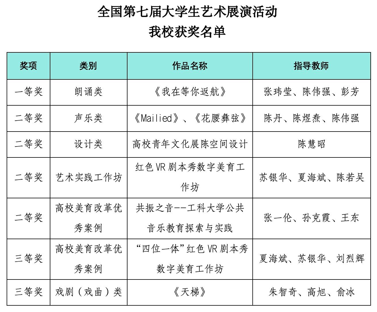 全国第七届大学生艺术展演活动开元获奖名单